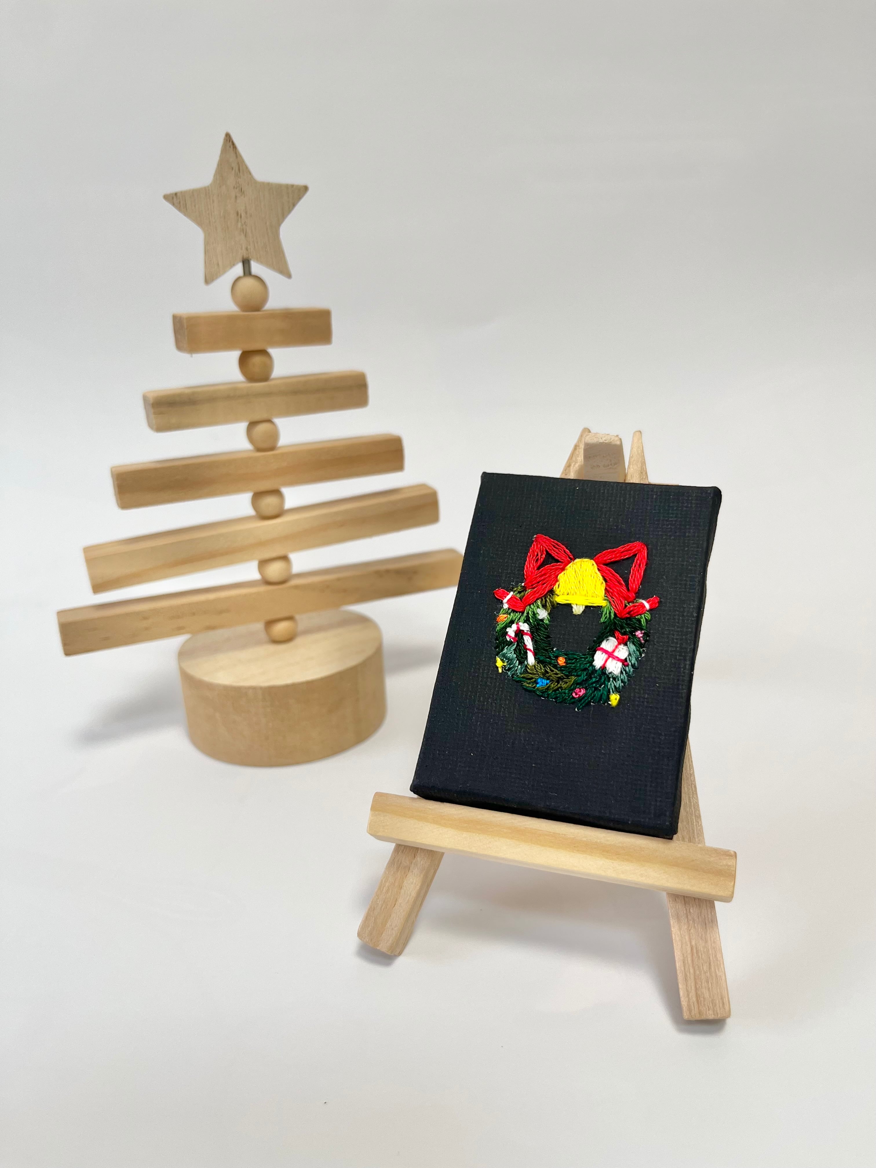 ミニチュアサイズのキャンバスに刺繍したミニチュアシリーズです。こちらは飾るためのイーゼルもセットになっています。机や棚の上にもちょこっと気軽に飾れます。